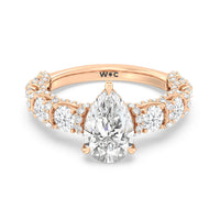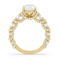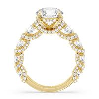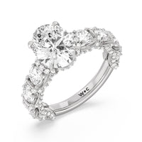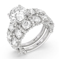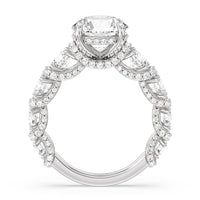 This luxe diamond engagement ring raises the standard with its impeccable detail. The brilliant round diamond shank is topped with a commanding center stone, securely held in a 4-prong claw prong setting within a diamond-traced prong basket. Accent diamonds line the shank of this luxury engagement ring, while a small diamond drape between all stones enhances the radiance. The diamond-encrusted sweeping trellises add dimension and elegance, making this a breathtaking choice.