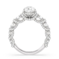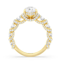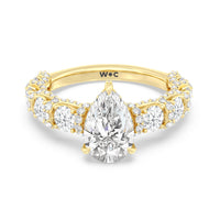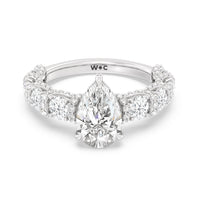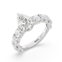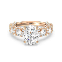 This luxe diamond engagement ring raises the standard with its impeccable detail. The brilliant round diamond shank is topped with a commanding center stone, securely held in a 4-prong claw prong setting within a diamond-traced prong basket. Accent diamonds line the shank of this luxury engagement ring, while a small diamond drape between all stones enhances the radiance. The diamond-encrusted sweeping trellises add dimension and elegance, making this a breathtaking choice.