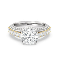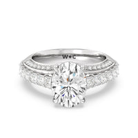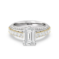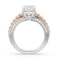 A captivating engagement ring for the bold bride-to-be. It features a parade of sparkle from its wide band adorned with princess-cut diamonds. The two glittering paths lead to a majestic central gem raised by a four-prong basket that's connected to an arching gallery encrusted with round diamonds.
