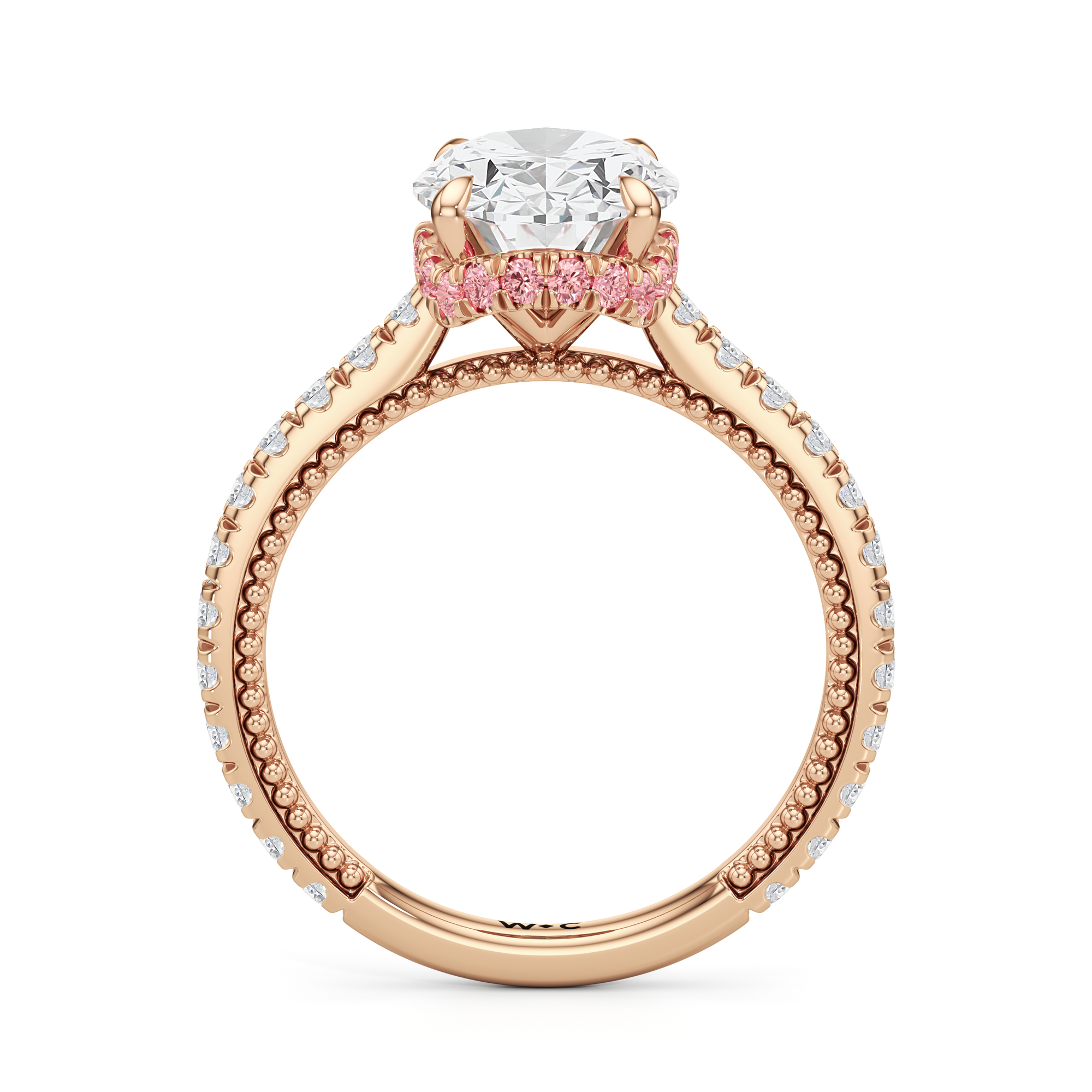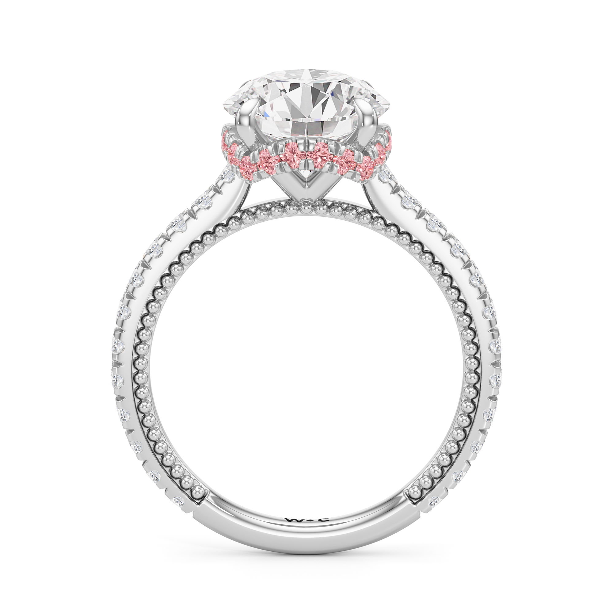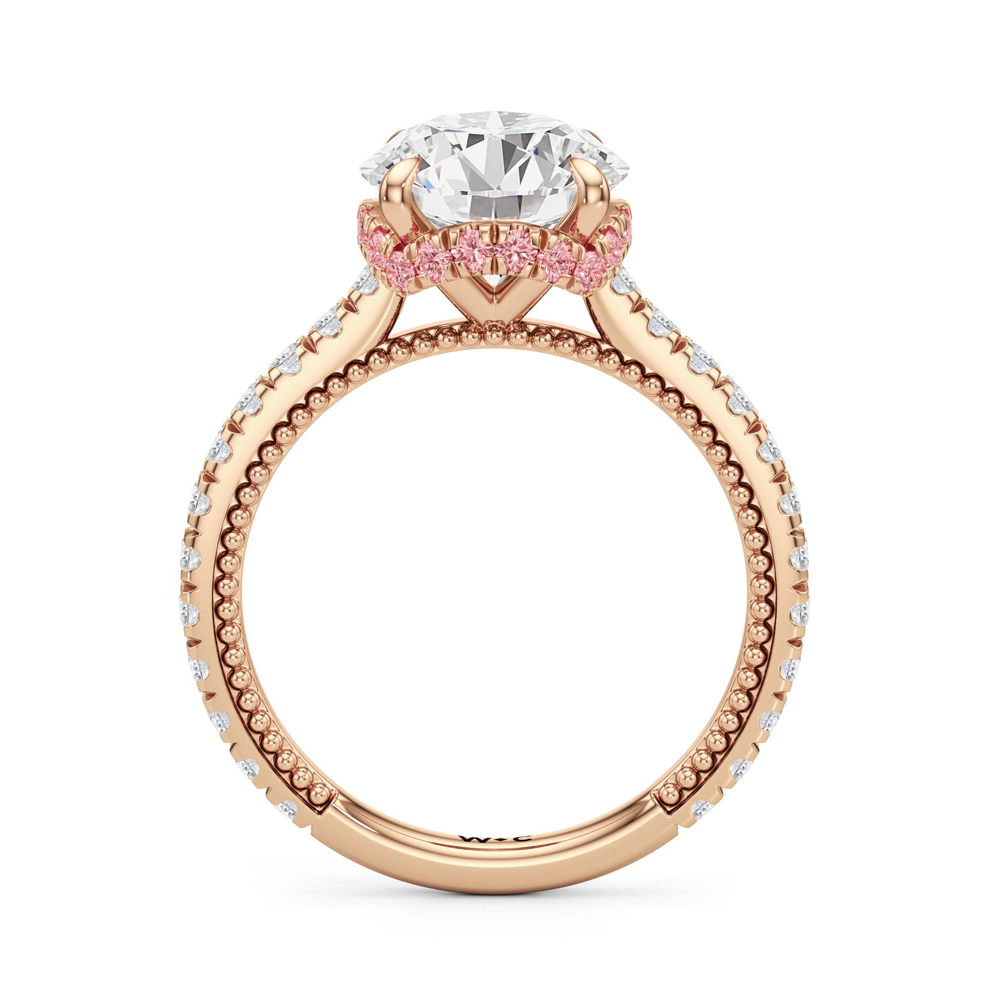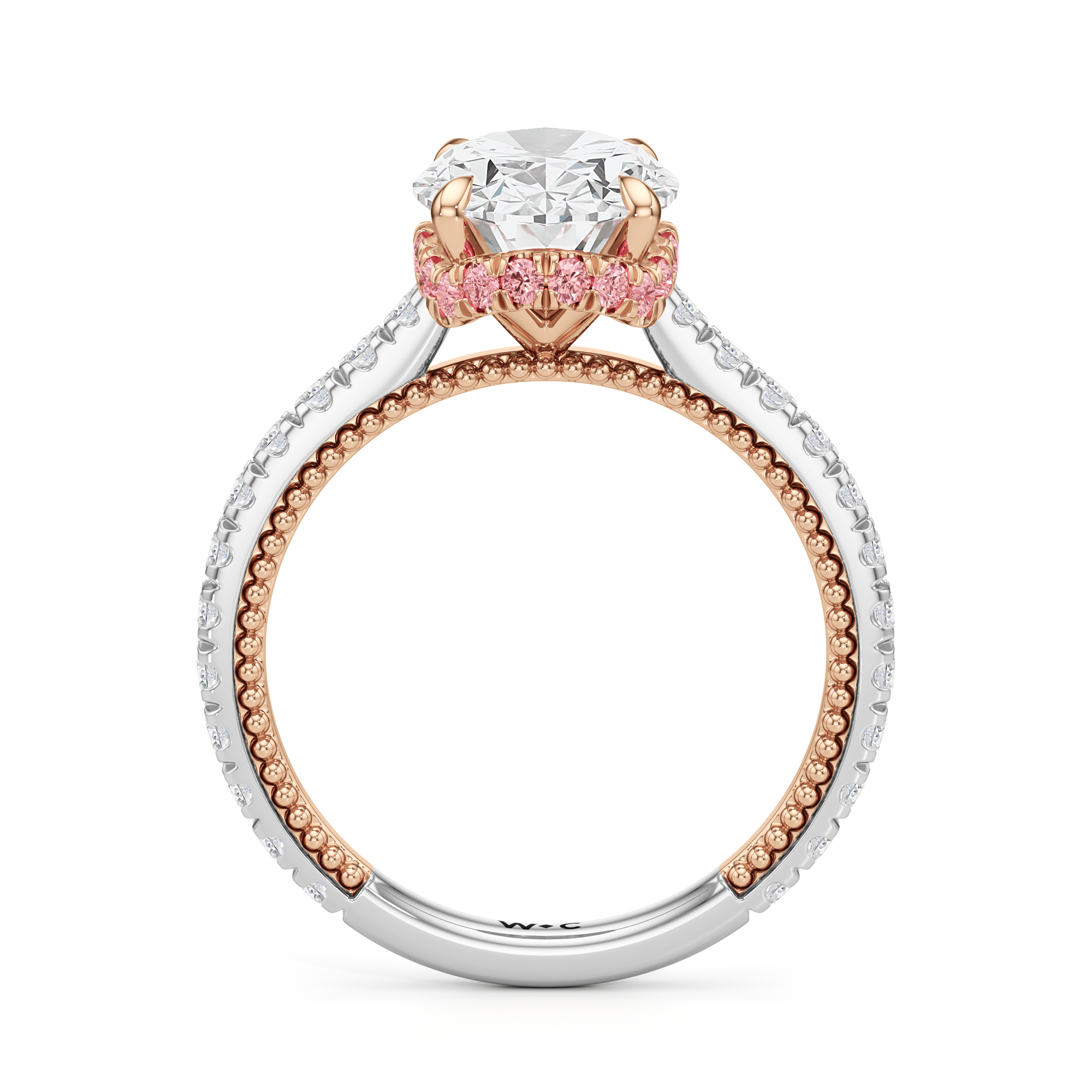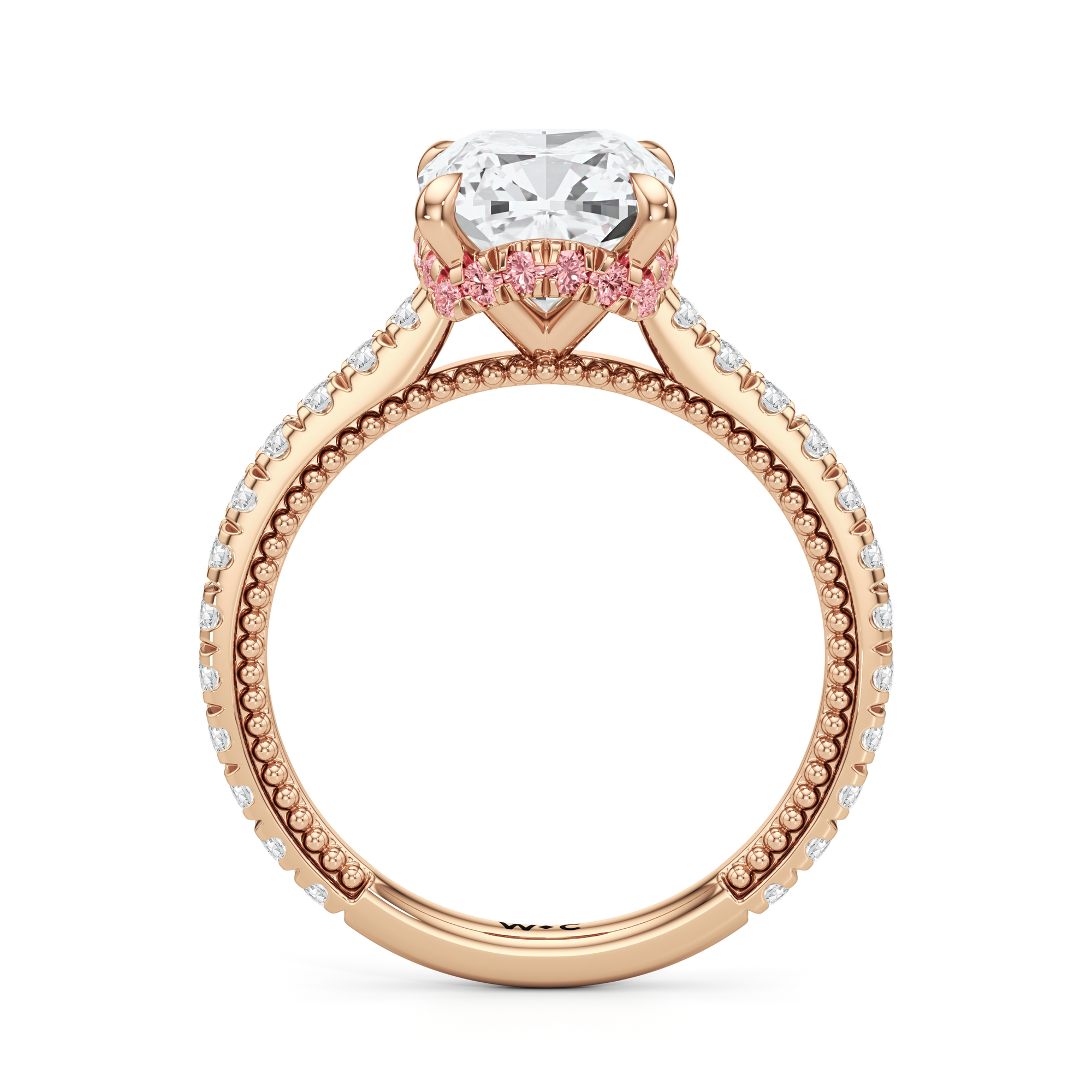 Peony's cathedral shank sweeps upward to frame a commanding centerstone. Pavé-set diamonds line the shoulders, merging poise with opulence. Beneath, lab-grown pink diamonds trace the basket's contours in a hidden halo, a secret detail for the most discerning eye.