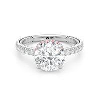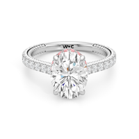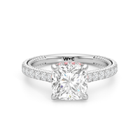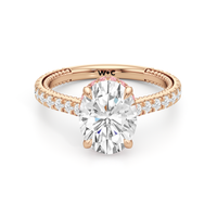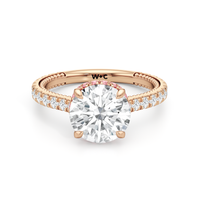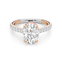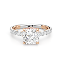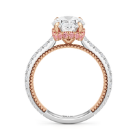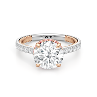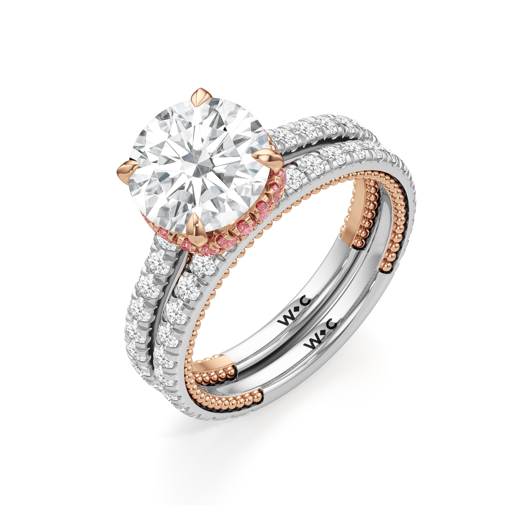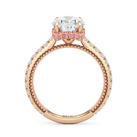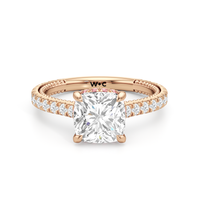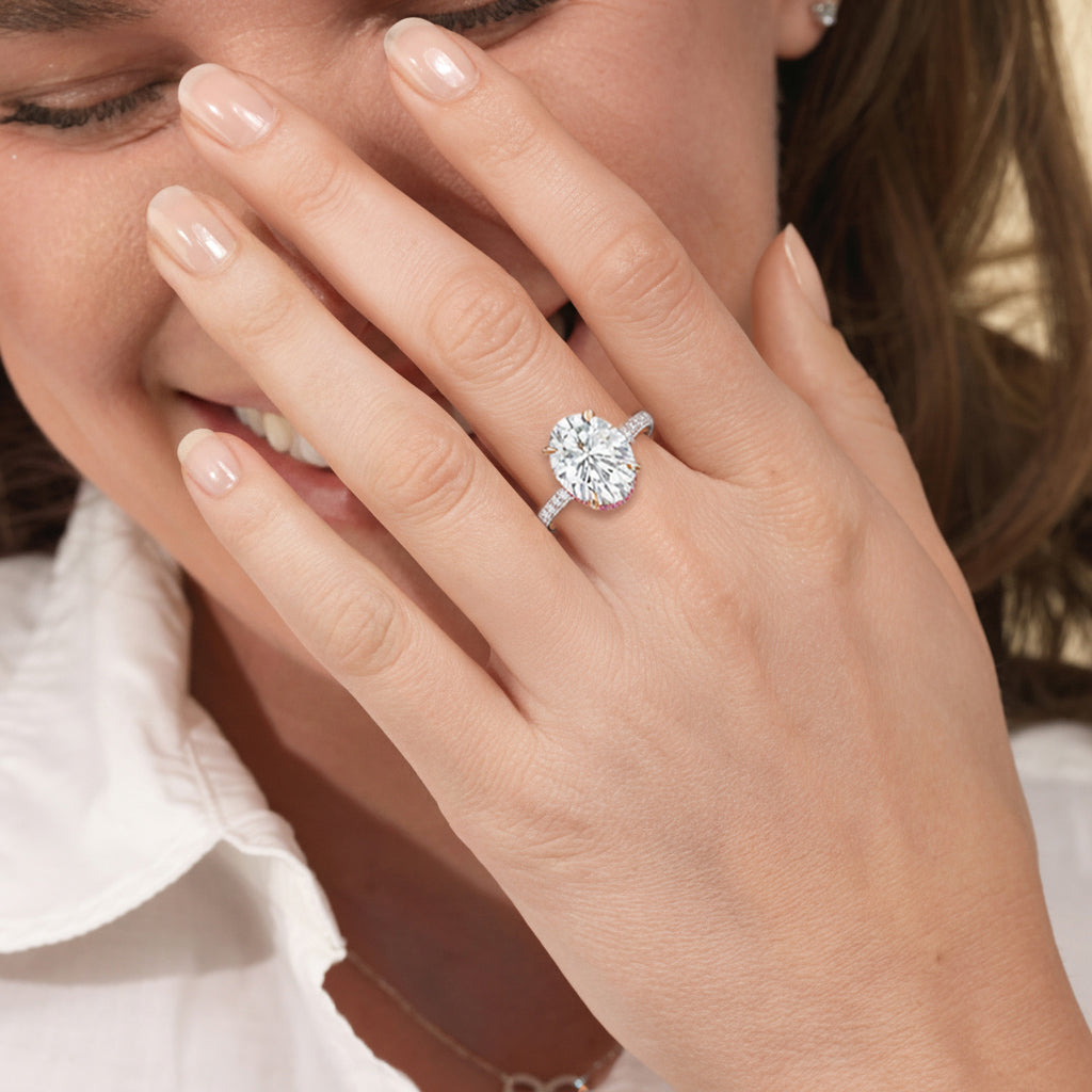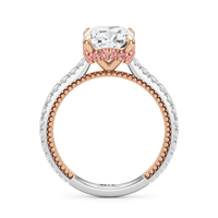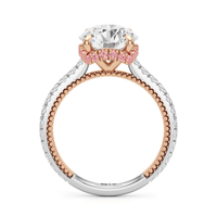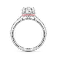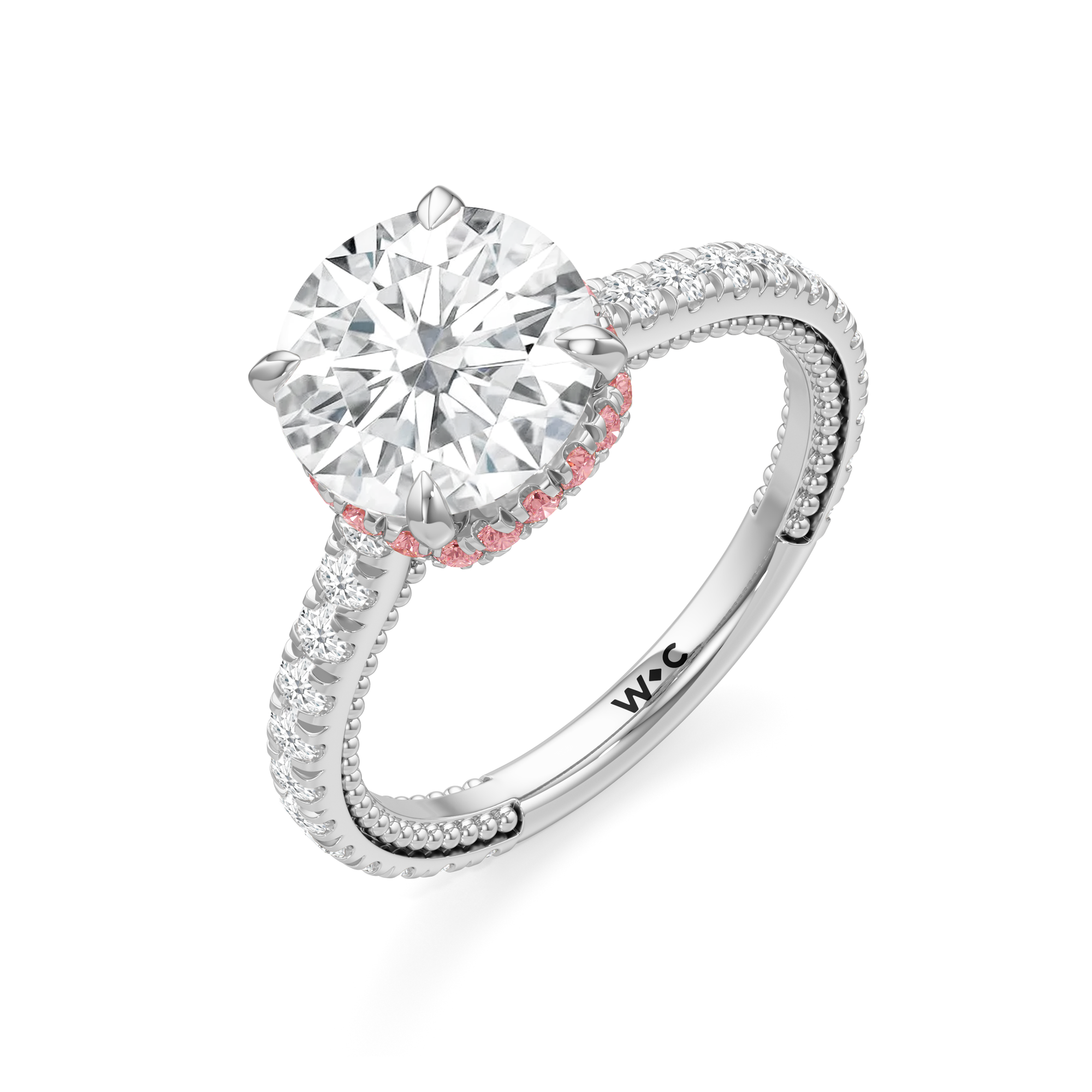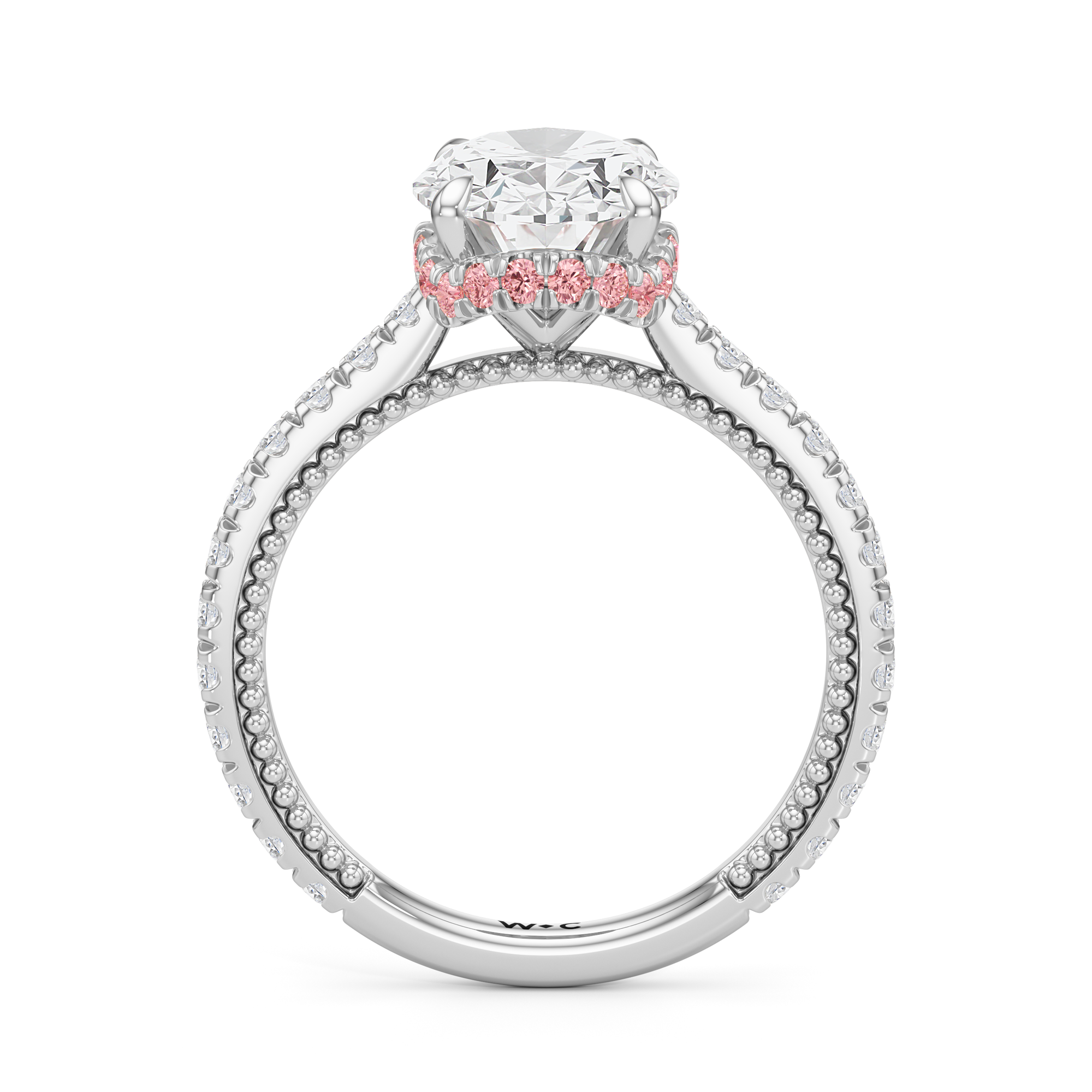 Peony's cathedral shank sweeps upward to frame a commanding centerstone. Pavé-set diamonds line the shoulders, merging poise with opulence. Beneath, lab-grown pink diamonds trace the basket's contours in a hidden halo, a secret detail for the most discerning eye.