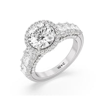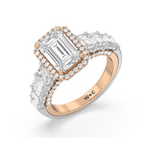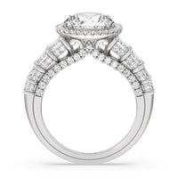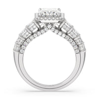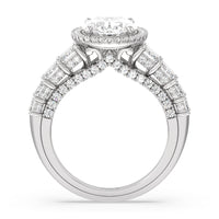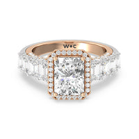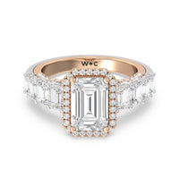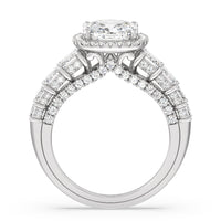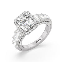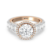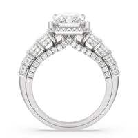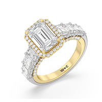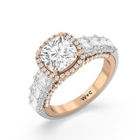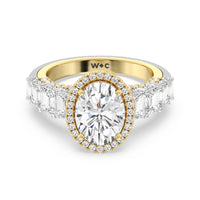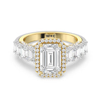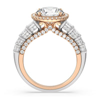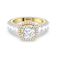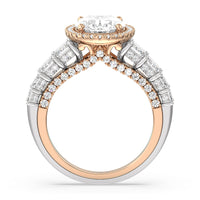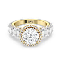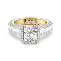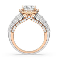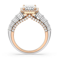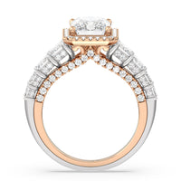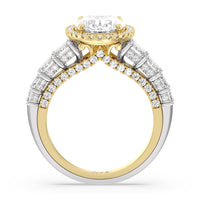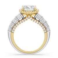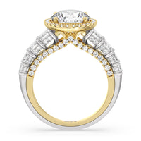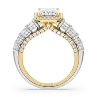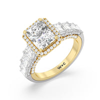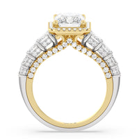 This two-toned engagement ring exudes refined opulence. It features princess-cut diamond side stones that shine brilliantly to complement the dazzling central gem. The diamond-encrusted bridge and the halo are in yellow gold for a contrast in color and shine.