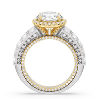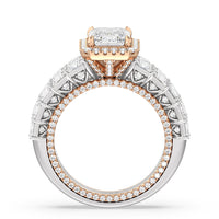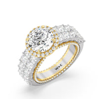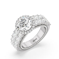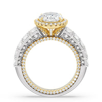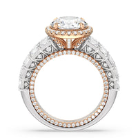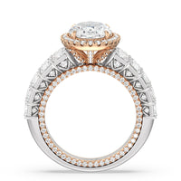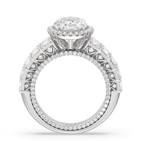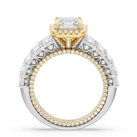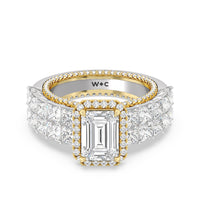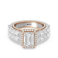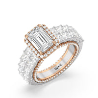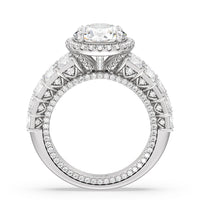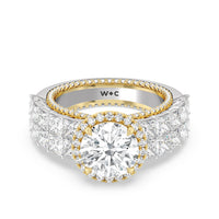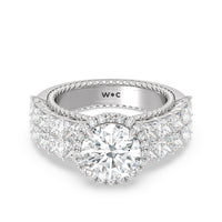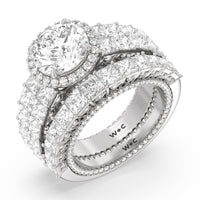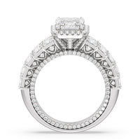 Radiating romance, this stellar ring is the perfect choice for a classic bride who also wants some glamour. The band features a stunning center diamond with a halo of more diamonds for extra sparkle. The shoulders of the band are lined with double rows of princess-cut diamonds that offer excellent brilliance. Amplifying the charm of the ring is a diamond-lined gallery plus a detailed bridge.