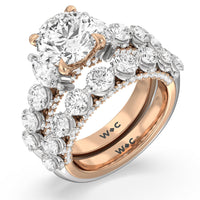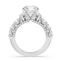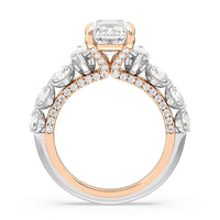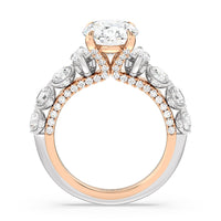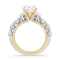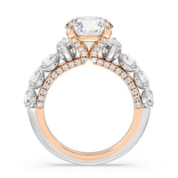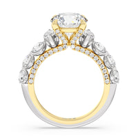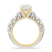 This is that ring that will make your beloved stare at her finger and smile from ear to ear. This two-toned piece features a diamond center stone secured by four diamond-studded prongs that extend to form the glittering gallery. The shoulders of the ring are lined with marquise-cut diamonds punctuated by round diamonds on its sides.