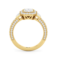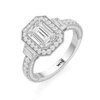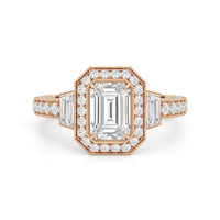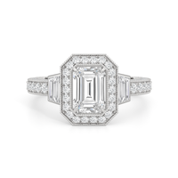 The Steinman Ring takes cues from the prominent steel arch structure that connects northern Manhattan to the Bronx. Its design is structured around the commanding lines and graceful curves of the Henry Hudson Bridge, echoing its powerful silhouette. An emerald-cut stone sits at the center of the band, framed by an octagonal halo of round diamonds and flanked by a duo of trapezoid-cut diamonds. The brilliant shine is carried through from the centerpiece to the band, with more round diamonds on baby prongs lining the three sides of the shank. Rows of tiny beads—done through a hand milgraining process—trace every edge, giving the ring the perfect blend of strength and sophistication.