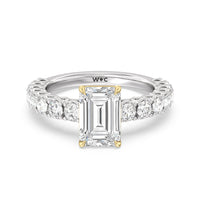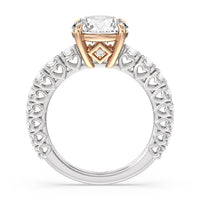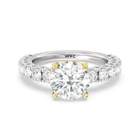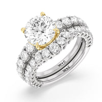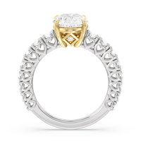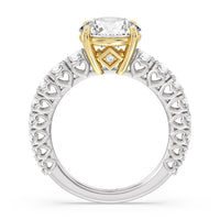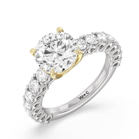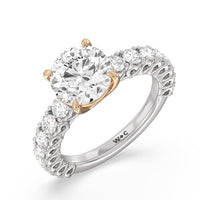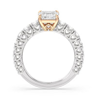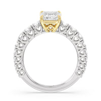 This highly ornate ring carries a character and brilliance of its own. The band is topped with a dazzling central diamond on a four-prong basket. Round-cut diamonds in graduating sizes run along the shank's shoulders. A sculpted yellow gold inner shank traced by a matching yellow gold heart pattern gives a romantic quality to this engagement ring.