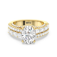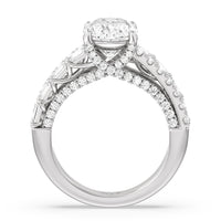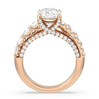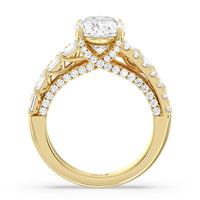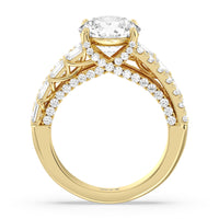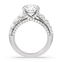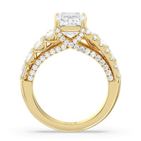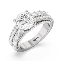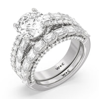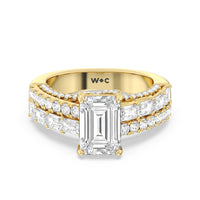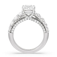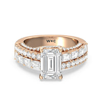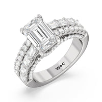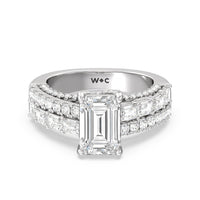 This ring is anything but ordinary. It has a non-traditional spirit with its wide band featuring alternating rows of round diamonds and emerald-cut diamonds. Mounted high up the shank is a central gem on diamond-studded cascading prongs that also bring glitter to the gallery.