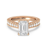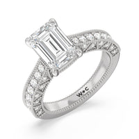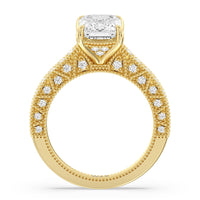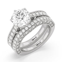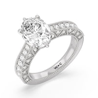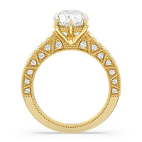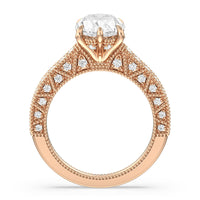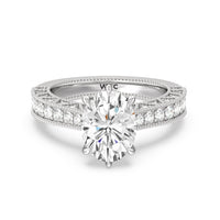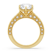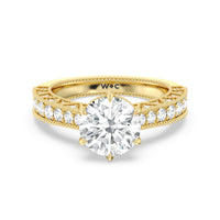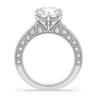 There is an inherently regal and romantic vibe to this diamond engagement ring. It features a diamond-studded shank that glitters from all angles. A view from the side showcases diamond accent stones separated by milgrain detailing in a chevron pattern. More tiny metal beads trace the edges of the ring and the six prongs that secure the centerstone. The subtle texture from the milgrain detailing infuses vintage romance to this luxurious piece.