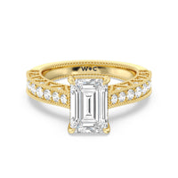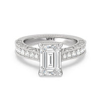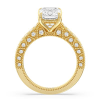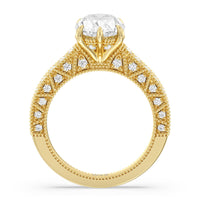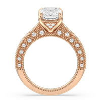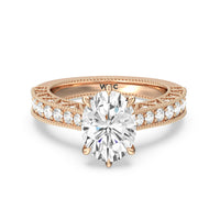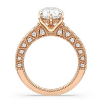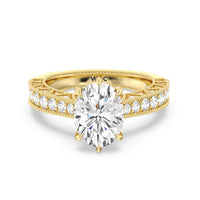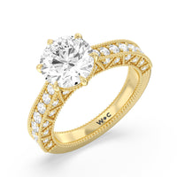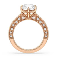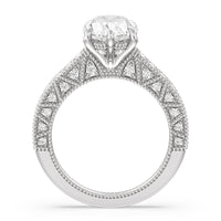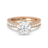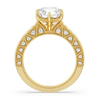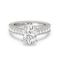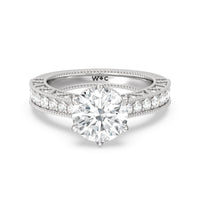 There is an inherently regal and romantic vibe to this diamond engagement ring. It features a diamond-studded shank that glitters from all angles. A view from the side showcases diamond accent stones separated by milgrain detailing in a chevron pattern. More tiny metal beads trace the edges of the ring and the six prongs that secure the centerstone. The subtle texture from the milgrain detailing infuses vintage romance to this luxurious piece.