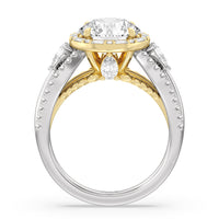 This engagement ring showcases the perfect balance of charm and glamour. It features a classic cathedral shank with pear-shaped diamond side stones nestled in between diamond pavé edges. The glistening arches lead to the center gem secured by four prongs and surrounded by a diamond halo. Refined detailing beneath the centerpiece brings a discreet charm to the ring.