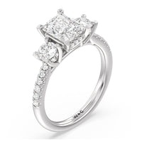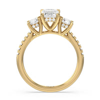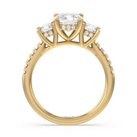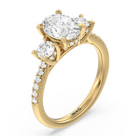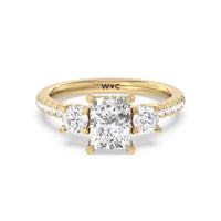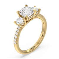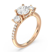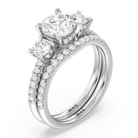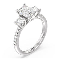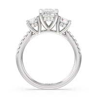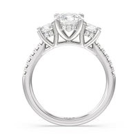 A three-stone token of love that's bursting with sparkle from every angle. This fine piece features a trio of twinkling diamonds in a cathedral setting. The shining centerpiece is flanked by shimmering side stones. A trio of hidden halos completes the glamorous glitter of this ring.