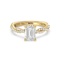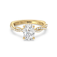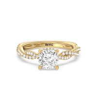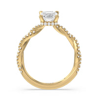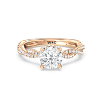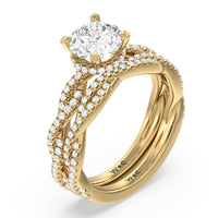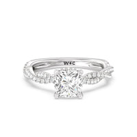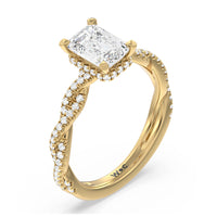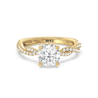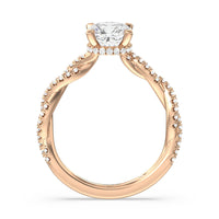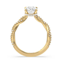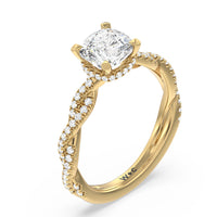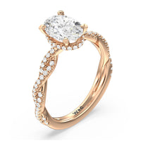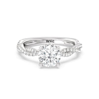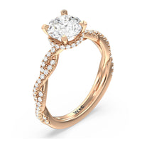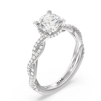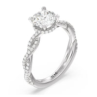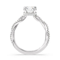 Romantic, whimsical, and distinct, this solitaire engagement ring stands out with its captivating central diamond and its modern and unconventional twisted split shank. Pave diamonds embellish the shapely shoulders of the band. The peek-a-boo sparkle from the hidden halo rounds out the extraordinary flair of this ring.