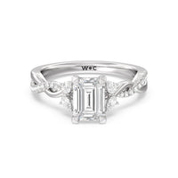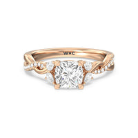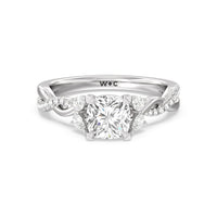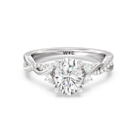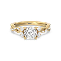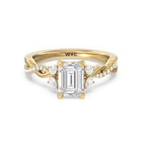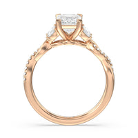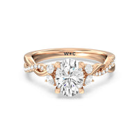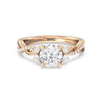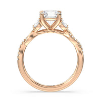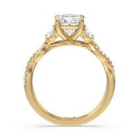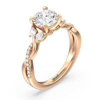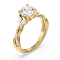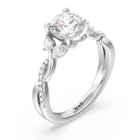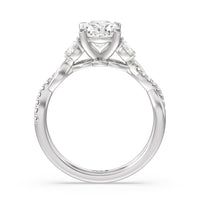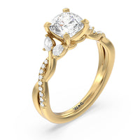 A radiant illustration of two halves becoming whole. This ring features two vine-like shanks twisting -one shiny and another showy - and meeting at a central point marked by a dazzling diamond. The center gem is elegantly framed by the sparkle of pear-shaped diamond side stones.
