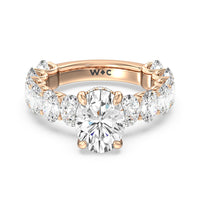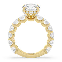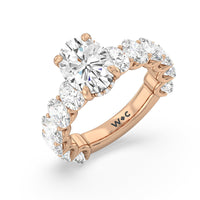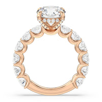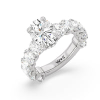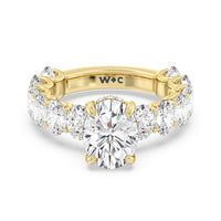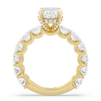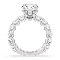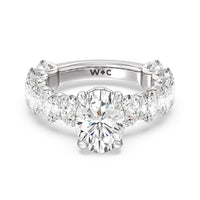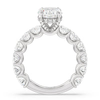 This diamond engagement ring impresses, whether viewed from the top or from the sides. The band is intricately decorated with oval side stones in U-shaped prongs. At the center is a captivating oval diamond that beautifully catches the light. Bringing extra sparkle to the main stone is a channel of round diamonds sitting just below the prong tips.