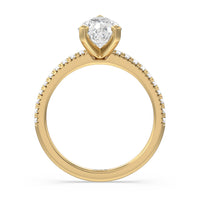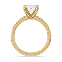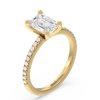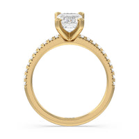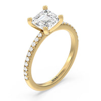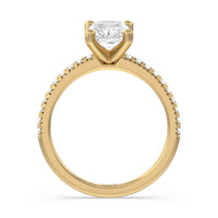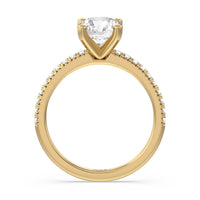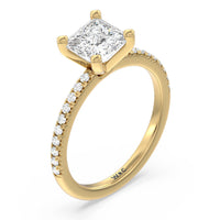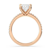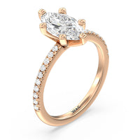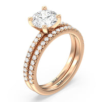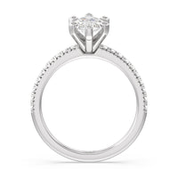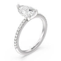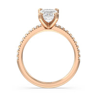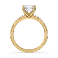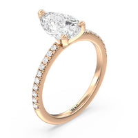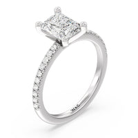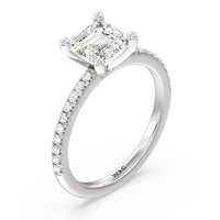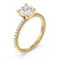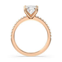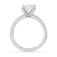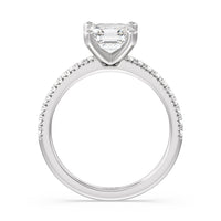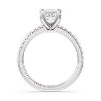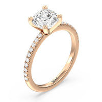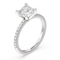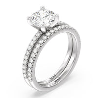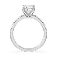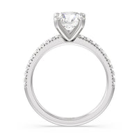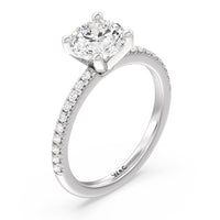 A graceful engagement ring design is set with french set diamond accents for an artful finish.