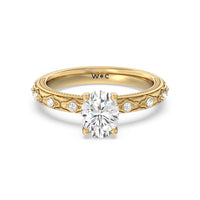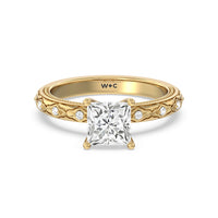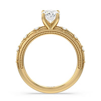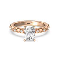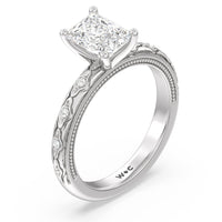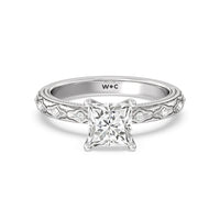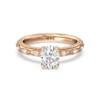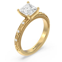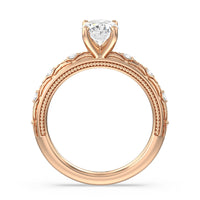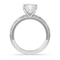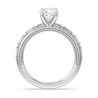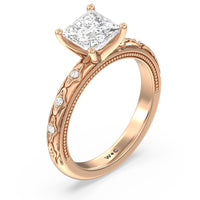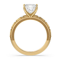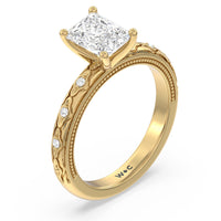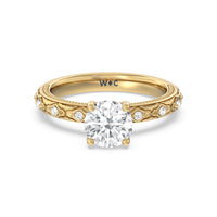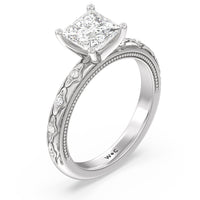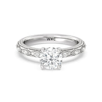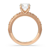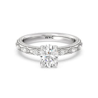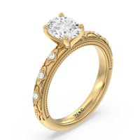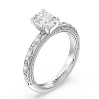 Featuring the traditional orange blossom motif of antique designs, this beautifully detailed ring showcases a stunning central diamond in a classic four-prong setting. Embellished with petal details, diamond pave, and fine milgrain on the cathedral shank including on the front view to create sparkle from every angle.