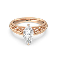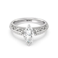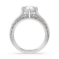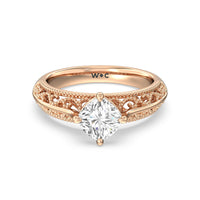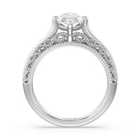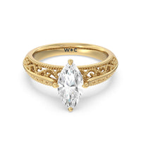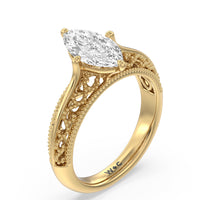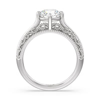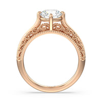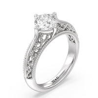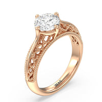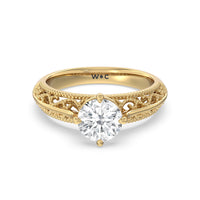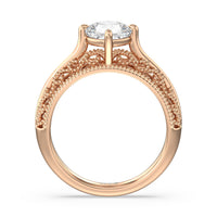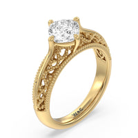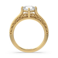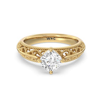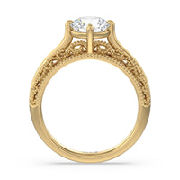 Modern and romantic aesthetics combine in this vintage-style beaded-filigree engagement ring. The cathedral shank draws the eye to the beautiful kite-set center stone. Set in gold.