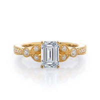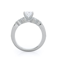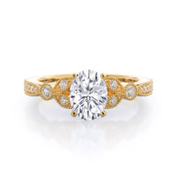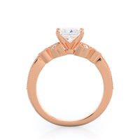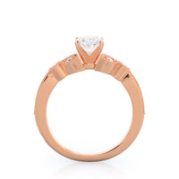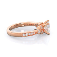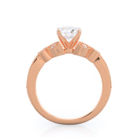 A beautiful vintage leaf pattern meets below the center stone at romantic points with hand milgrain and bezel and pave setting styles for diamonds