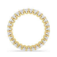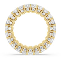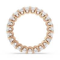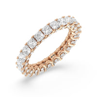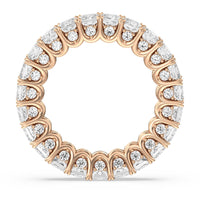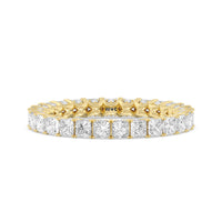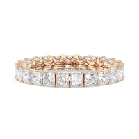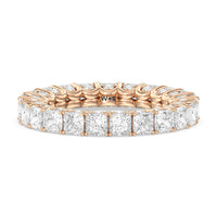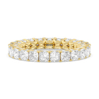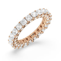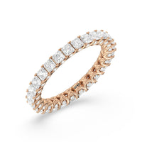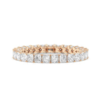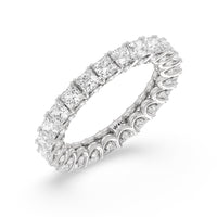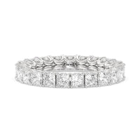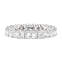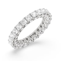 A ring of infinite sparkle. This eternity band in white gold features U-shaped split prong baskets securing brilliant Princess diamonds. A scalloped profile forms on the inside of the ring and delivers a unique look. More petite round diamonds punctuate each U-shaped curve of each prong for brilliance that shine at any angle.