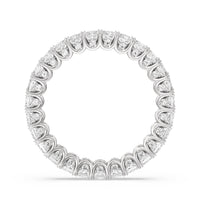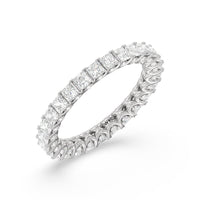 A ring of infinite sparkle. This eternity band in white gold features U-shaped split prong baskets securing brilliant Princess diamonds. A scalloped profile forms on the inside of the ring and delivers a unique look. More petite round diamonds punctuate each U-shaped curve of each prong for brilliance that shine at any angle.
