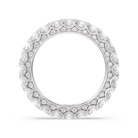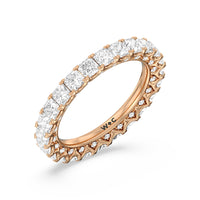 A bold yet dainty eternity ring to crown one's finger with maximum brilliance. This white gold piece features Princess diamonds on decorative split prongs that stem from a high-polish inner shank. The spaces in between the slightly raised prongs are studded with petite round diamonds for a seamless shine.