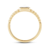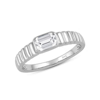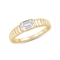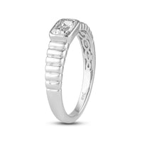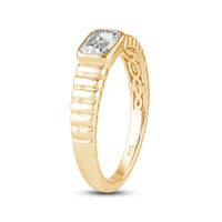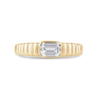 A ring designed to be minimal with an element of whimsy. This token of love is meant for fashion-forward men who look for a refined and elegant engagement ring that delivers a bold statement. The band's shoulders have a ribbed profile with rounded edges for comfort, style, and balance. Giving sparkle to this ring is a lone diamond secured in a full bezel setting.