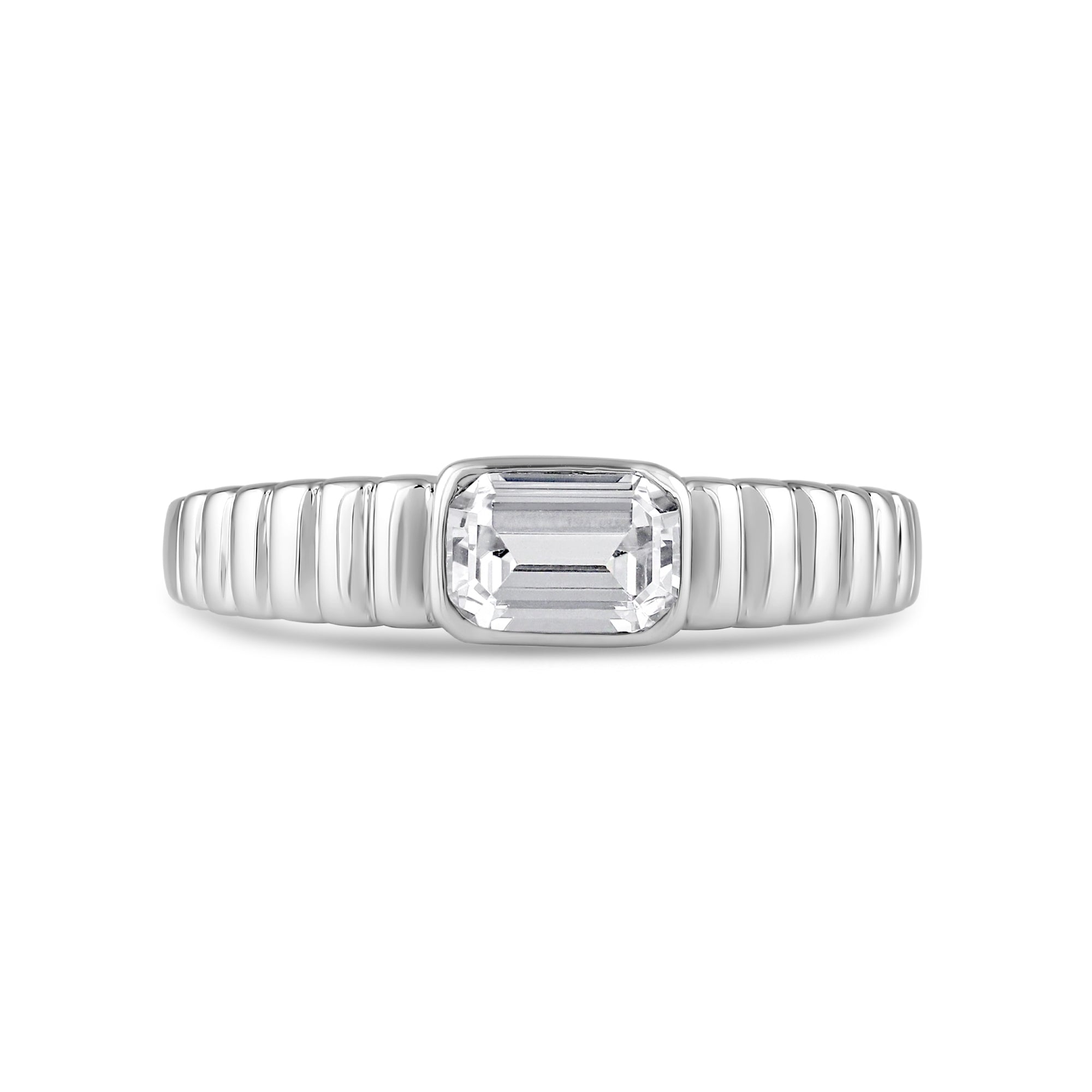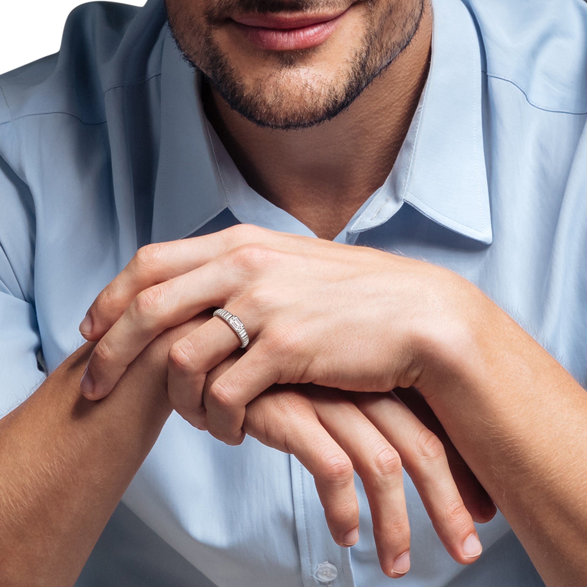 A ring designed to be minimal with an element of whimsy. This token of love is meant for fashion-forward men who look for a refined and elegant engagement ring that delivers a bold statement. The band's shoulders have a ribbed profile with rounded edges for comfort, style, and balance. Giving sparkle to this ring is a lone diamond secured in a full bezel setting.
