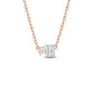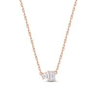 The beauty of restraint is clearly evident in this necklace. It features a slender necklace chain holding a two-stone pendant composed of a round and emerald-cut diamond. Those who love luxury but appreciate subtlety will be instantly drawn to this two-stone diamond necklace's easy elegance.