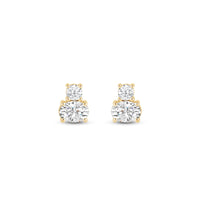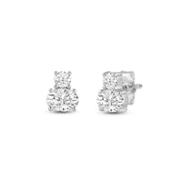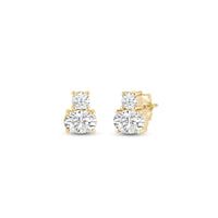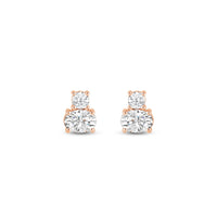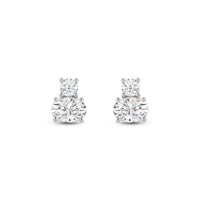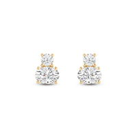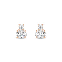 These two-stone stud earrings feature a design that embraces simplicity and elegance. Each stud has a two-stone setting, with a round diamond and an oval diamond set on prongs. The versatile look of this pair makes it suitable for any outfit or occasion.