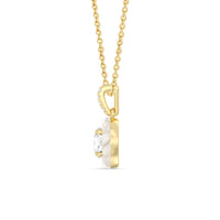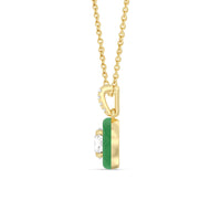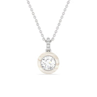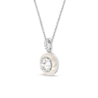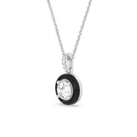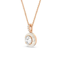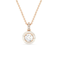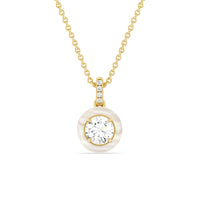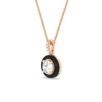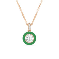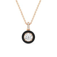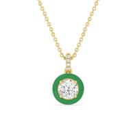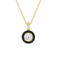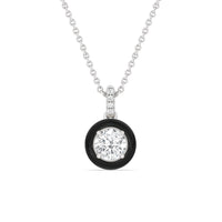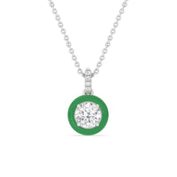 The pop of color from this piece is exactly the bright and cheery boost your jewelry collection needs. This necklace features a round pendant with a ceramic frame surrounding a round diamond on four claw prongs. The bail is also traced with tiny round diamonds.