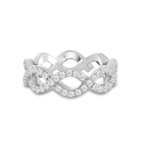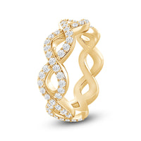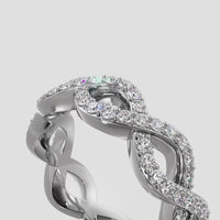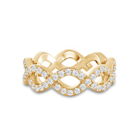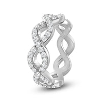 A token of never-ending love, or of infinite possibilities and endless opportunities. This woven band with two interlaced ribbons, each traced by prong-set round diamonds, will be a radiant reminder of whatever meaning you put into it. Regardless of how you see this diamond-encrusted full infinity ring, expect it to leave a lasting impression.