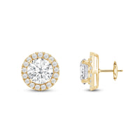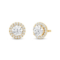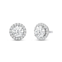 Classic round cut earrings with a stunning halo of round stones encircling the center stone.A lovely outfit-maker, this pair of stud earrings is what you need to give any ensemble a polished, put-together finish.