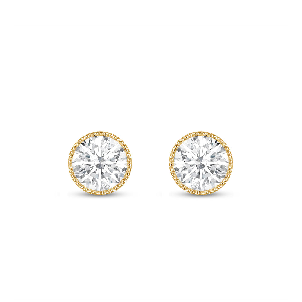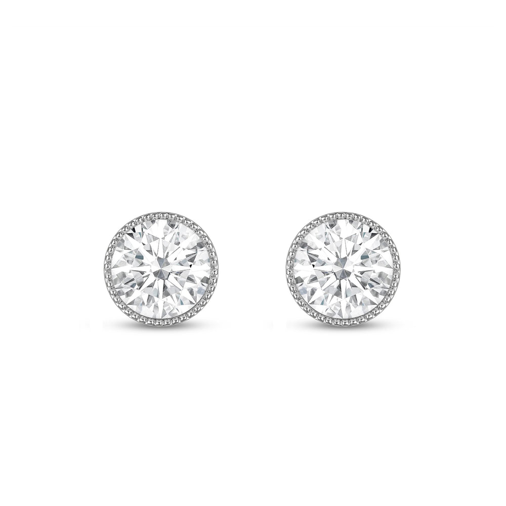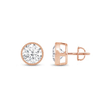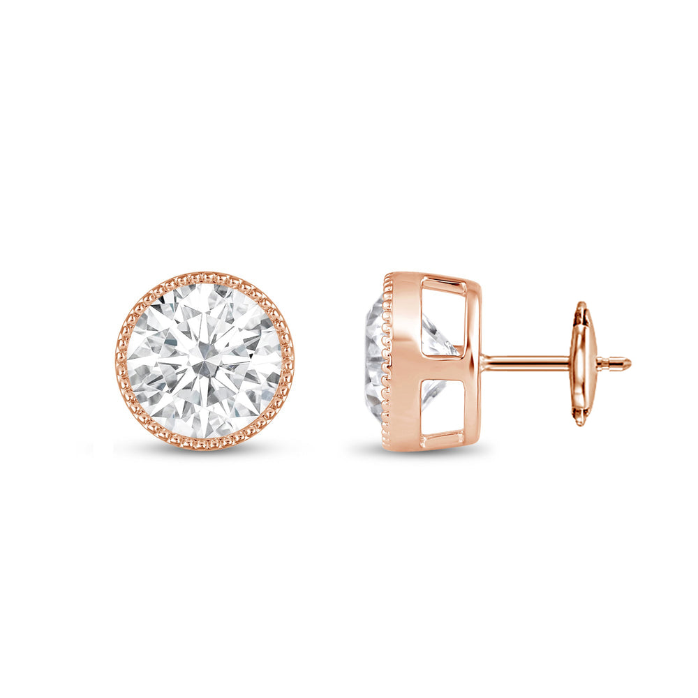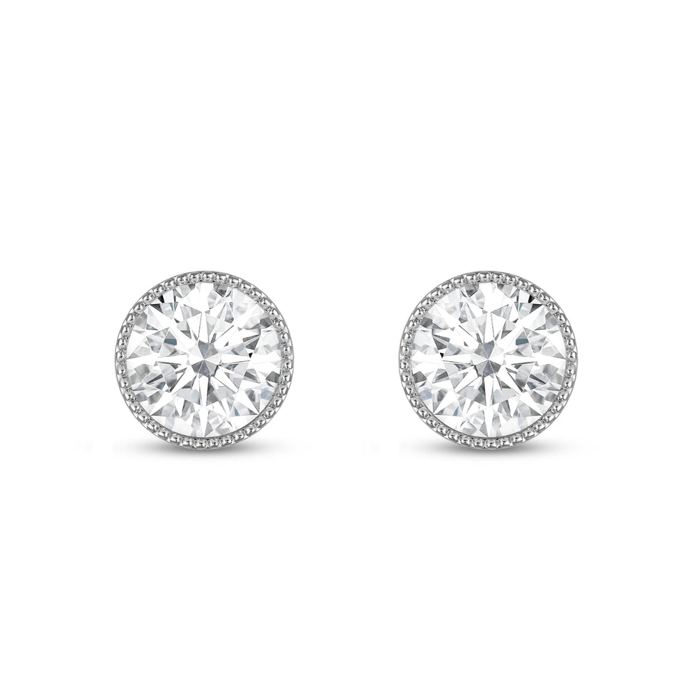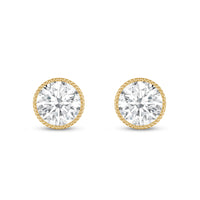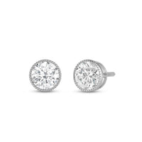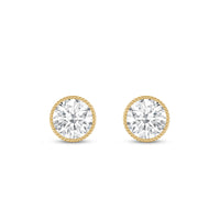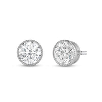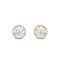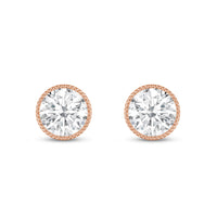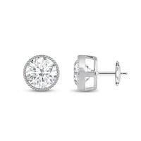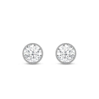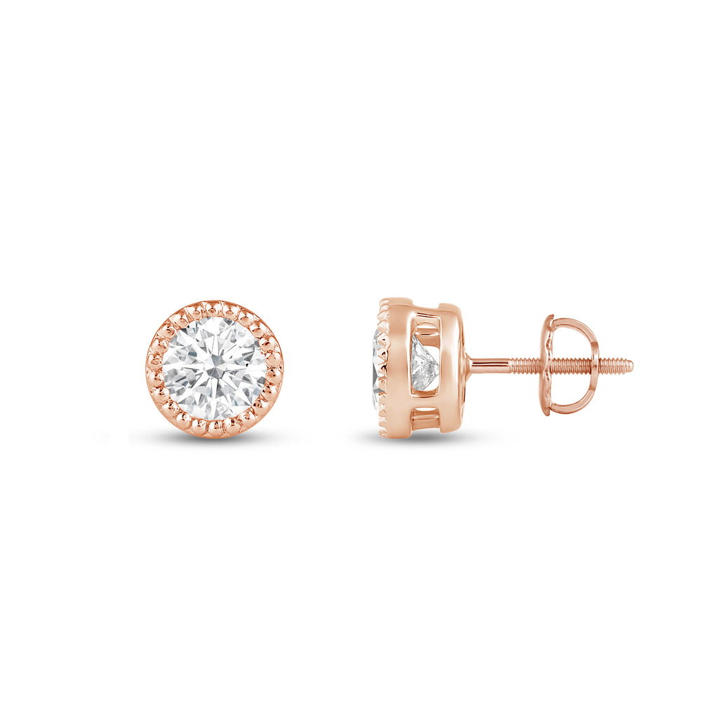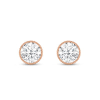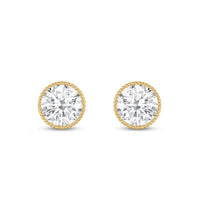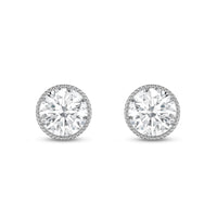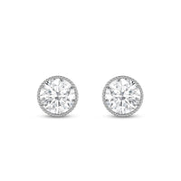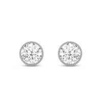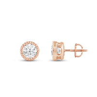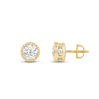 A round shaped milgrain halo perfectly surrounds a round stone for a vintage inspired look. This is a perfect pair of earrings for everyday with a unique vintage flair. These earrings are secured with a push backing.