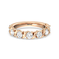 Made for a hopeless romantic, this anniversary ring charms with its understated sparkle and tactile detail. The highly polished band features seven round diamonds, each mounted on a two-prong setting. A polished metal ribbon swirls in between each brilliant gemstone for a curvy and visually fluid aesthetic.