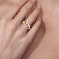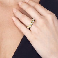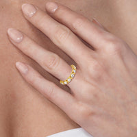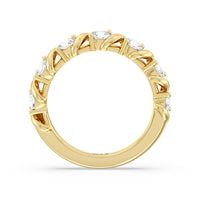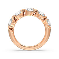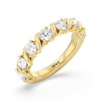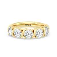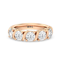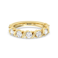 Made for a hopeless romantic, this anniversary ring charms with its understated sparkle and tactile detail. The highly polished band features seven round diamonds, each mounted on a two-prong setting. A polished metal ribbon swirls in between each brilliant gemstone for a curvy and visually fluid aesthetic.