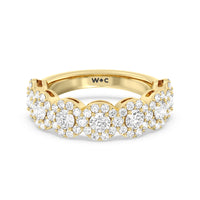 What a brilliant reminder of your everlasting love and commitment! This sophisticated stunner features a polished band with half of its circumference traced by five round diamonds, each one encircled by an alluring no-gap diamond halo. Both symbolic and stylish, this anniversary ring of enduring elegance will prove to be as lasting as your love.