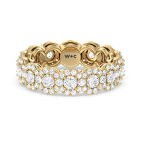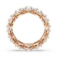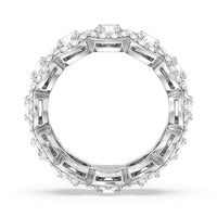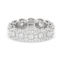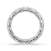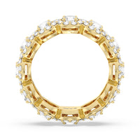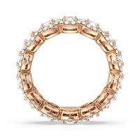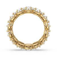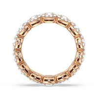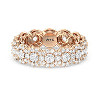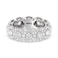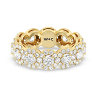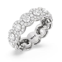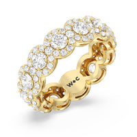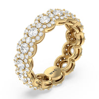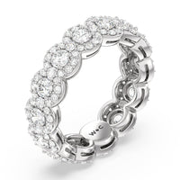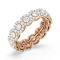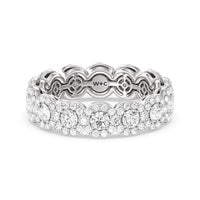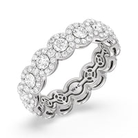 This diamond eternity ring has a look that's incredibly alluring. The band is made up of round diamonds encircled by no gap halos of even more diamonds. The striking and unforgettable sparkle of this ring is the perfect representation of love that glows and grows.