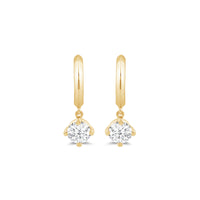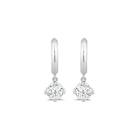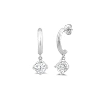 These sparklers are all about edgy simplicity. Each earring features a round diamond in a kite setting gently dropping from a white gold huggie with a knife-edge silhouette. This pair is great for everyday wear and for giving your basic ensembles that little extra edge.
