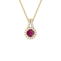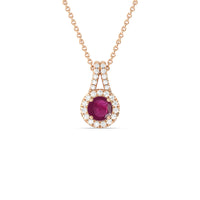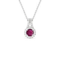 The refined elegance of this gemstone pendant allows you to elevate the look of any outfit in an instant. The pendant features a round Ruby on its center framed by a classic halo of lab-grown diamonds. A diamond-studded split bale holds the halo-wrapped colored gem.