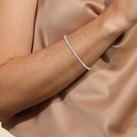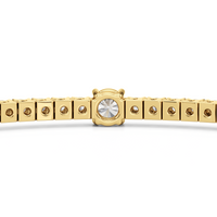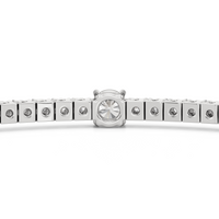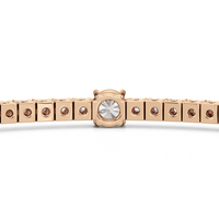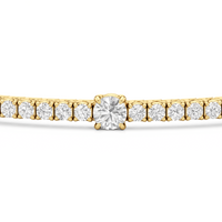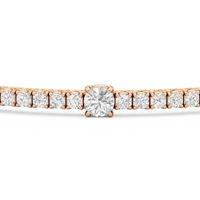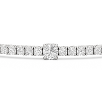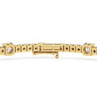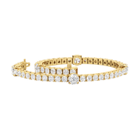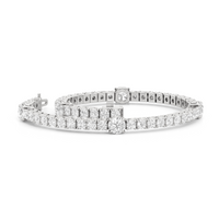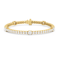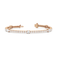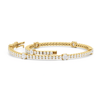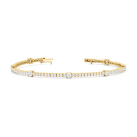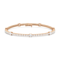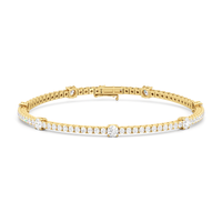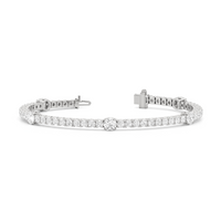 Minimal yet still making a subtle statement, this diamond tennis bracelet offers versatility that spans various outfits and occasions. The bracelet's entire length is traced by petite round diamonds on claw prongs, punctuated on five stations by five larger round diamonds.