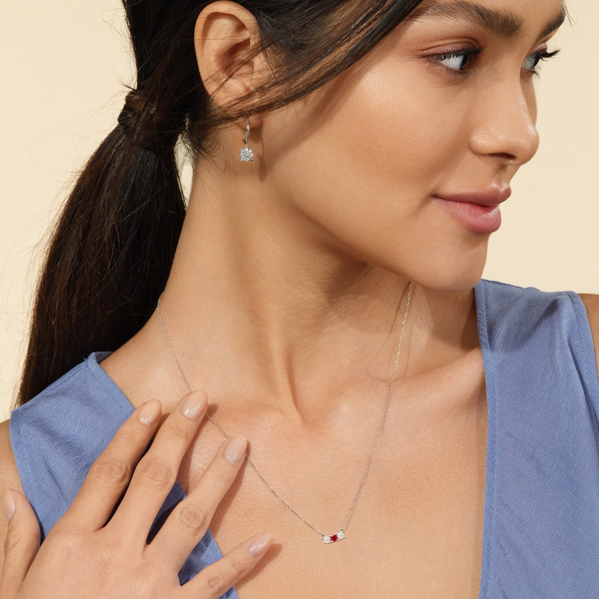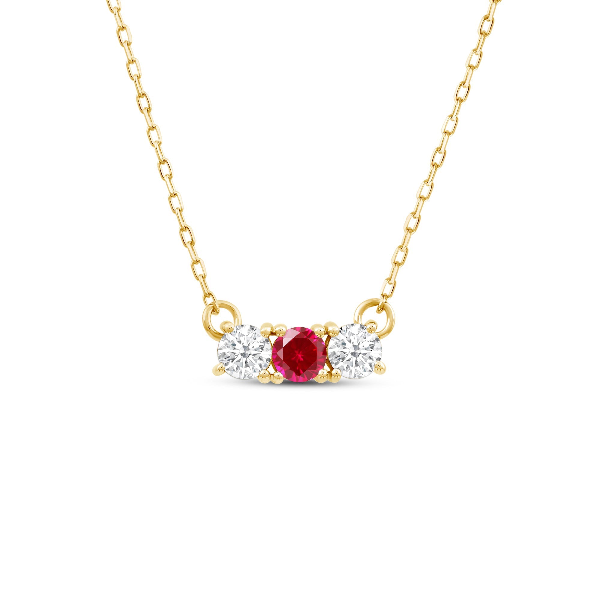 Let the subtle and sweet sparkle of this ruby and diamond necklace instantly upgrade the look of your LBD, business suit, or your basic jeans and tee. This dainty piece features a short row of five diamonds held by a yellow gold necklace chain. This necklace with a radiant five-stone pendant looks perfect when worn alone or layered with other minimalist necklaces.