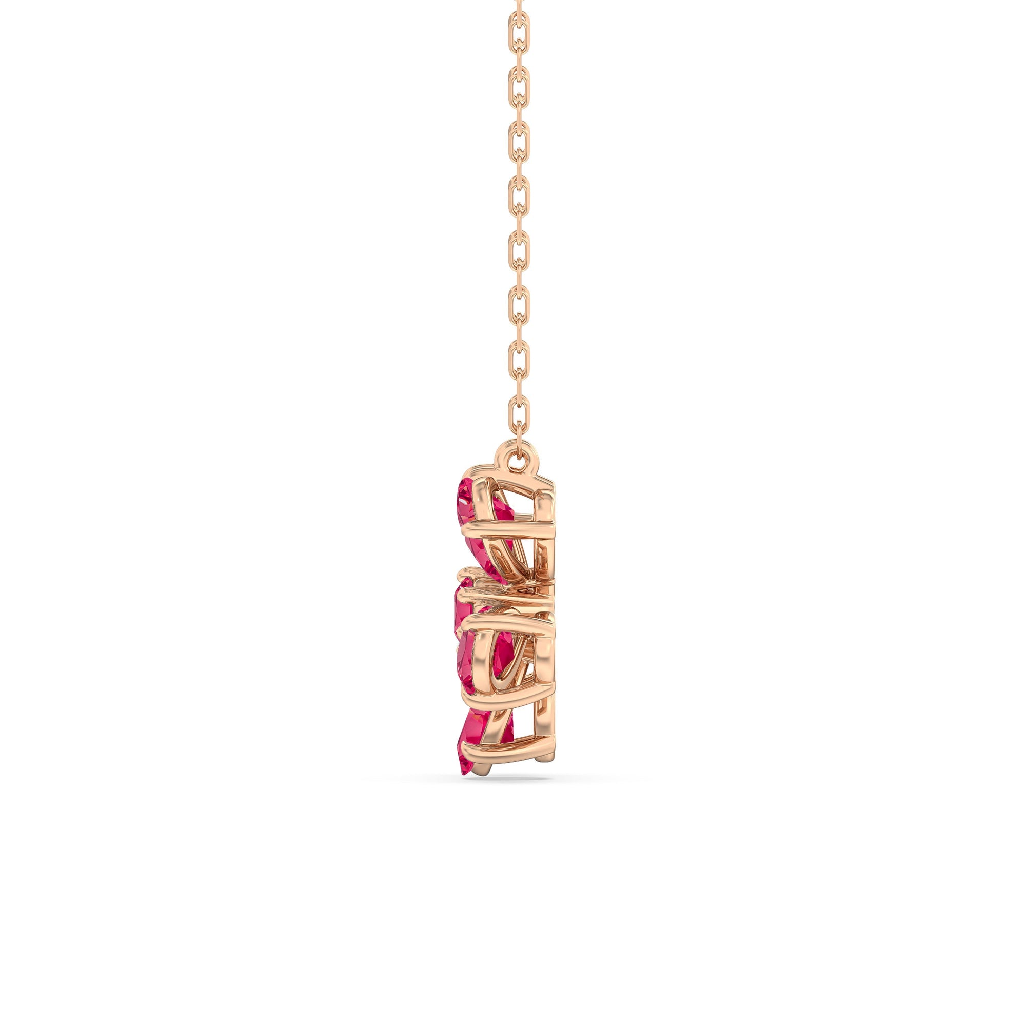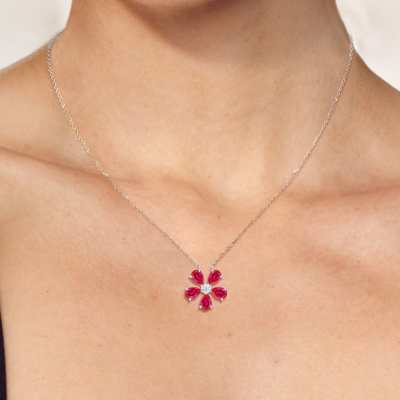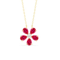 The Daisy Necklace captures the essence of feminine refinement and élan. This piece blooms with five pear-cut ruby petals surrounding a round center diamond. From the delicate floral motif, a subtle brilliance bursts forth like a breath of fresh air. This diamond necklace is the perfect graceful addition to your ensemble.