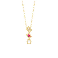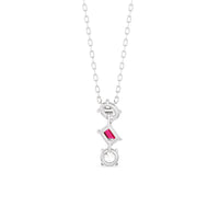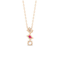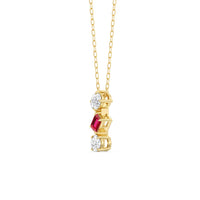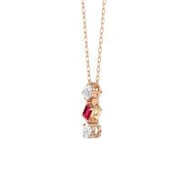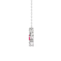 This ruby and diamond trilogy necklace embraces modern elegance with its minimalist aesthetic. It features a vertical row of oval, pear, and round diamonds, Designed with no distracting embellishments, this necklace's pure beauty shines.