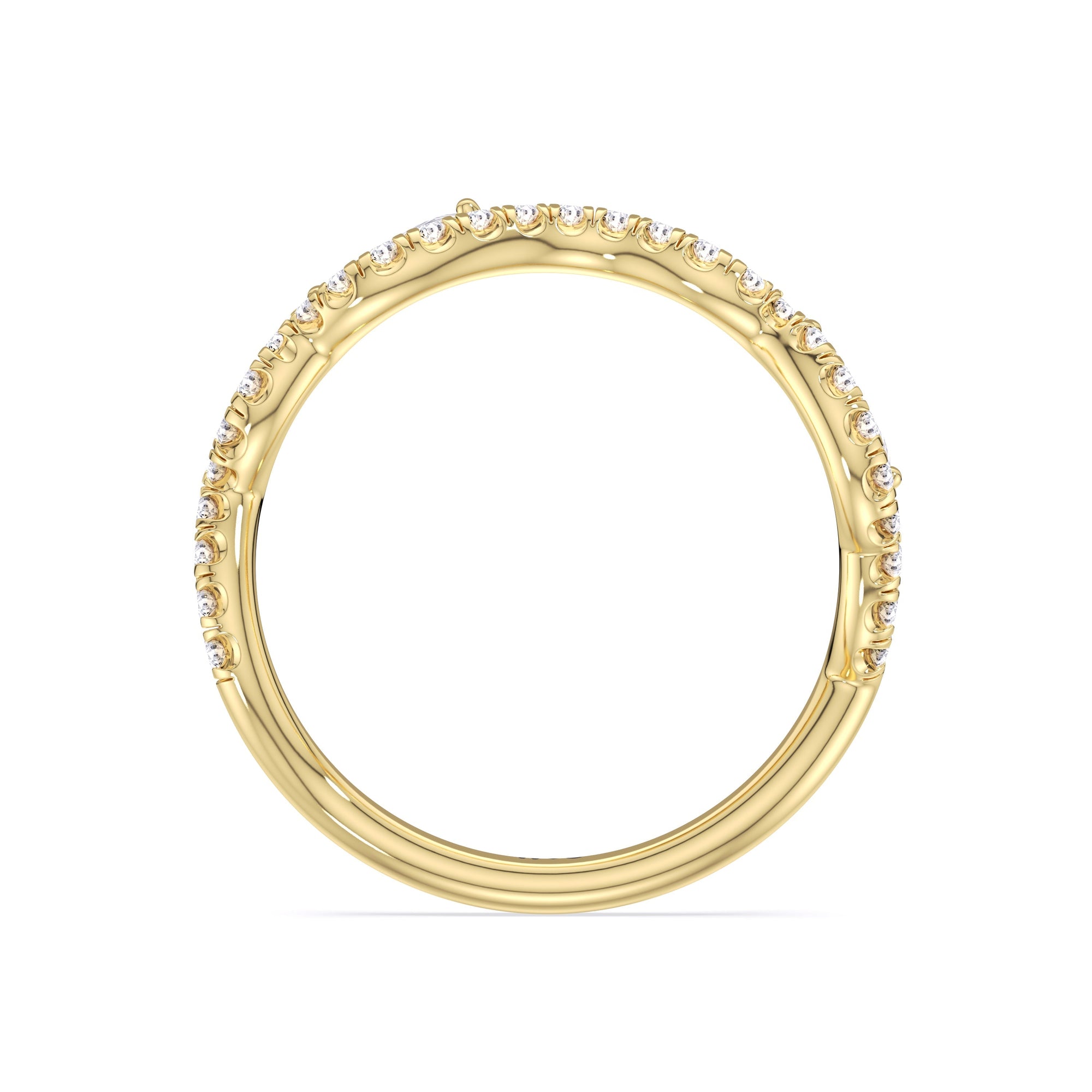 This curved diamond set wedding band is perfectly contoured to complement our ‘insert engagement ring title’ for a simple and sophisticated look.