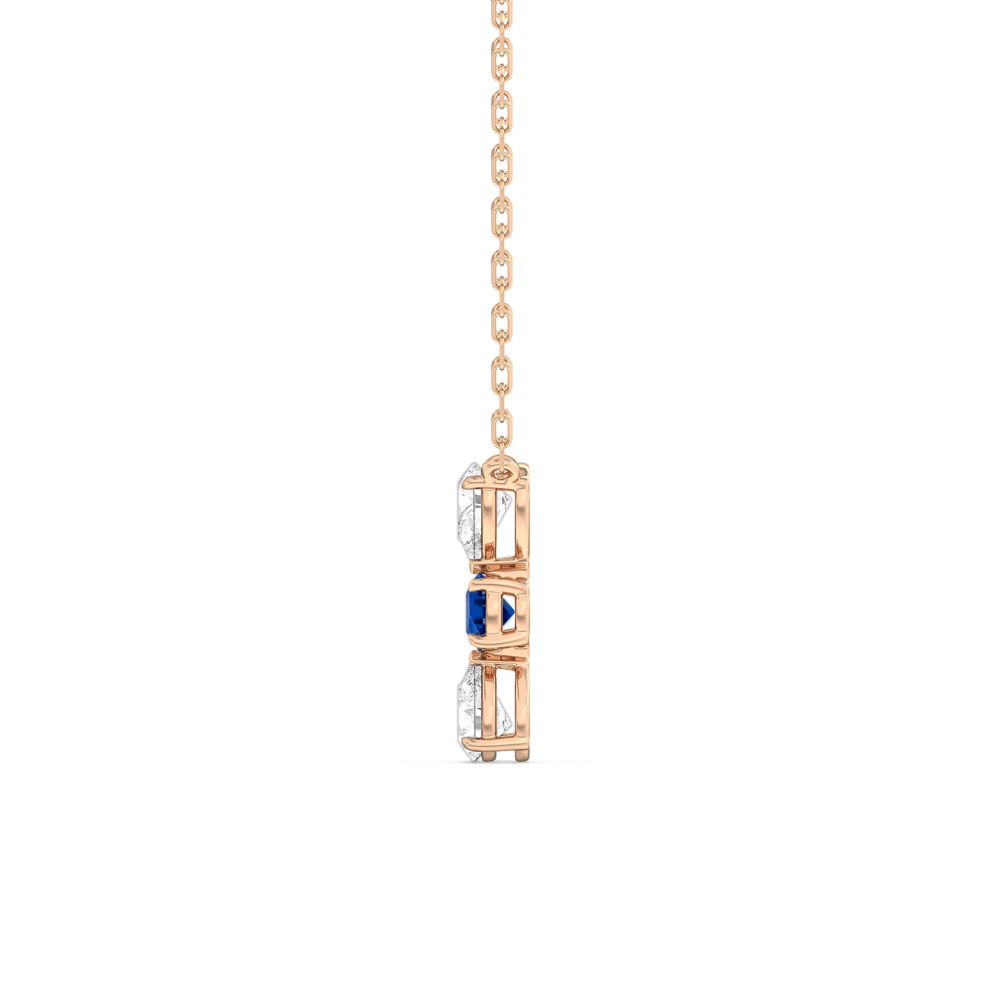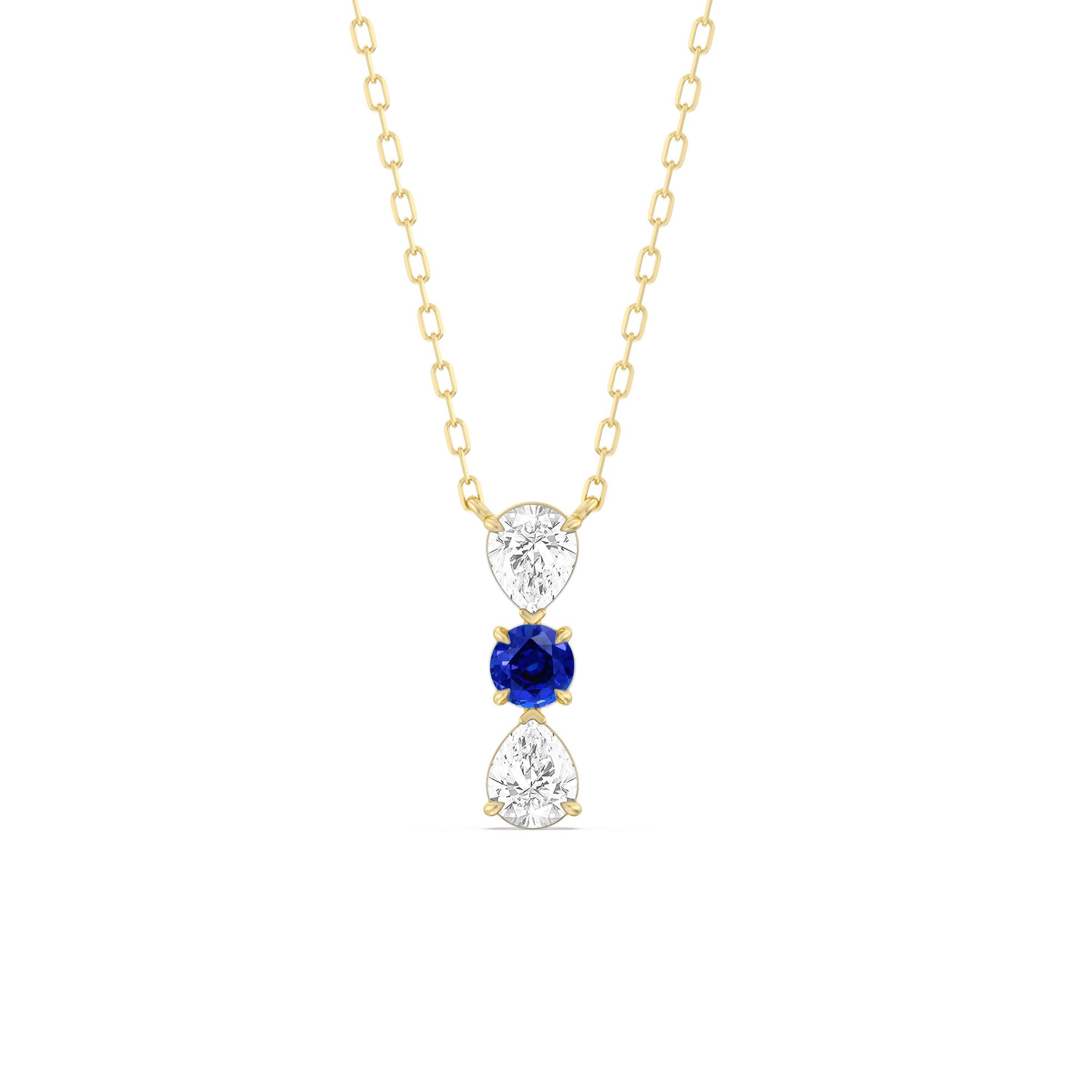 Let everyone know of your refined style through this sapphire and diamond necklace. It carries three diamonds mounted in a vertical layout, with round sapphire set in between two pear diamonds. Its less-is-more design goes beyond fleeting trends, making this necklace a timeless sparkler that will endure for a long time.