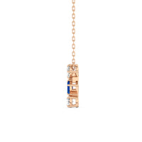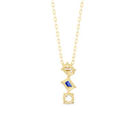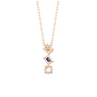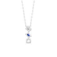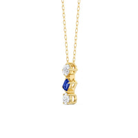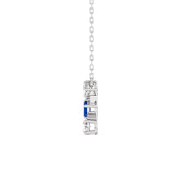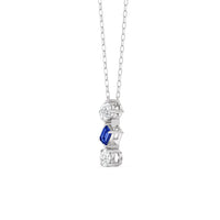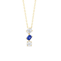 This sapphire and diamond trilogy necklace embraces modern elegance with its minimalist aesthetic. It features a vertical row of oval, pear, and round diamonds, Designed with no distracting embellishments, this necklace's pure beauty shines.