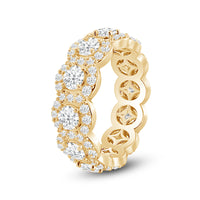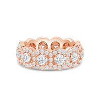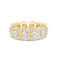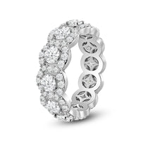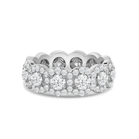 Extravagance practically shoots off of this mesmerizing ring. It features a scalloped band topped with round diamonds that are haloed by smaller round diamonds. Packed with sheer brilliance and visual appeal, there is no doubt this ring will impress.