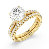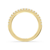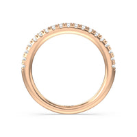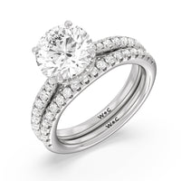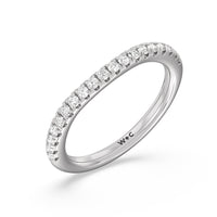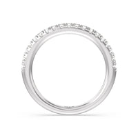 This curved diamond set wedding band is perfectly contoured to complement our scalloped hidden halo with sudded gallery engagement ring for a simple and sophisticated look.