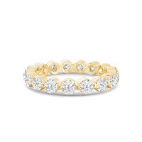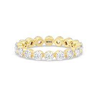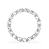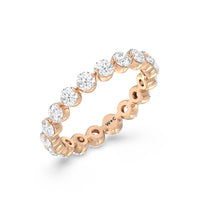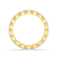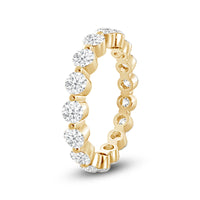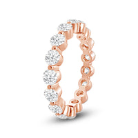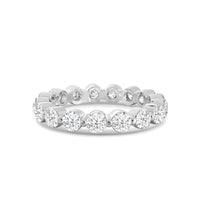 The sophisticated simplicity of this eternity ring makes it worthy to be a part of your jewelry collection. Indulge in the bountiful brilliance of the round diamonds spaced by single prongs. The scalloped bezel links that make up the band add to the alluring charm of this ring.