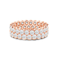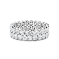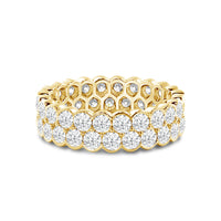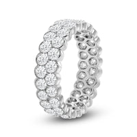An eternity ring that makes a loud and clear style statement. It features a scalloped band with two rows of round diamonds in half bezels. Expect this stunner to garner attention regardless of metal type or carat.
